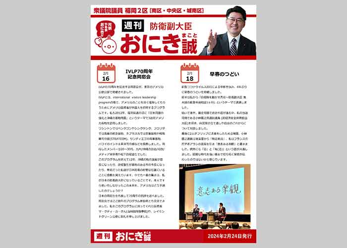 今週の『週刊おにき誠』では、「IVLP70周年、記念同窓会」「早春のつどい」についてまとめております。